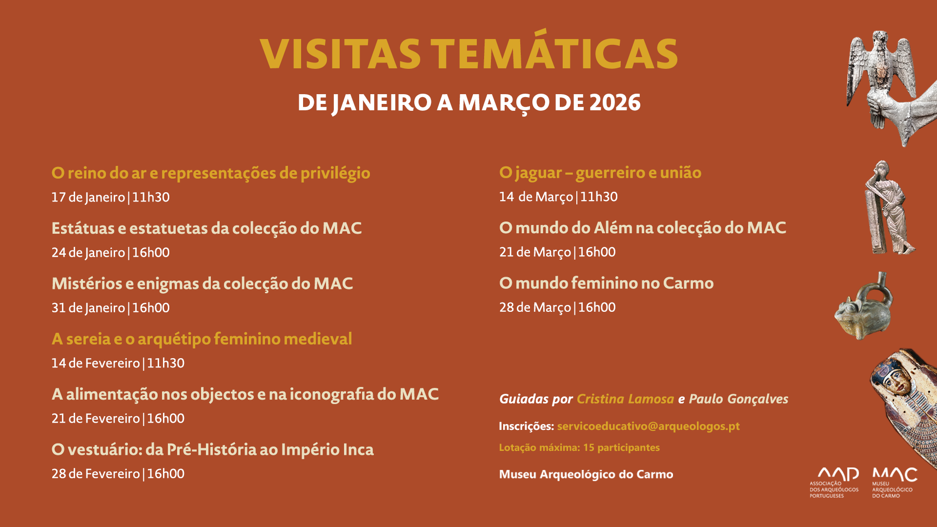 | 1 | O Reino do Ar e Representações de Privilégio | Ciclo - O Bestiário do MACO MAC, situado nas ruínas da Igreja da Santa Maria do Carmo, abriga uma coleção arqueológica que abrange milhares de anos, e nela existe um elemento que está sempre presente para quem está atento: animais, grandes e pequenos, estão espalhados e ansiosos para serem conhecidos. Para começar o ano 2026, em janeiro, venham conhecer as aves do Museu Arqueológico do Carmo. Viajaremos com os pombos, com os melros, e com as gaivotas que pelo museu sobrevoam (com a permissão da Carlota que os observa sempre com um olho atento), ao encontro das águias esculpidas em pedra e do falcão que habita o túmulo de D. Fernão Sanches.Guiada por Cristina Lamosa |